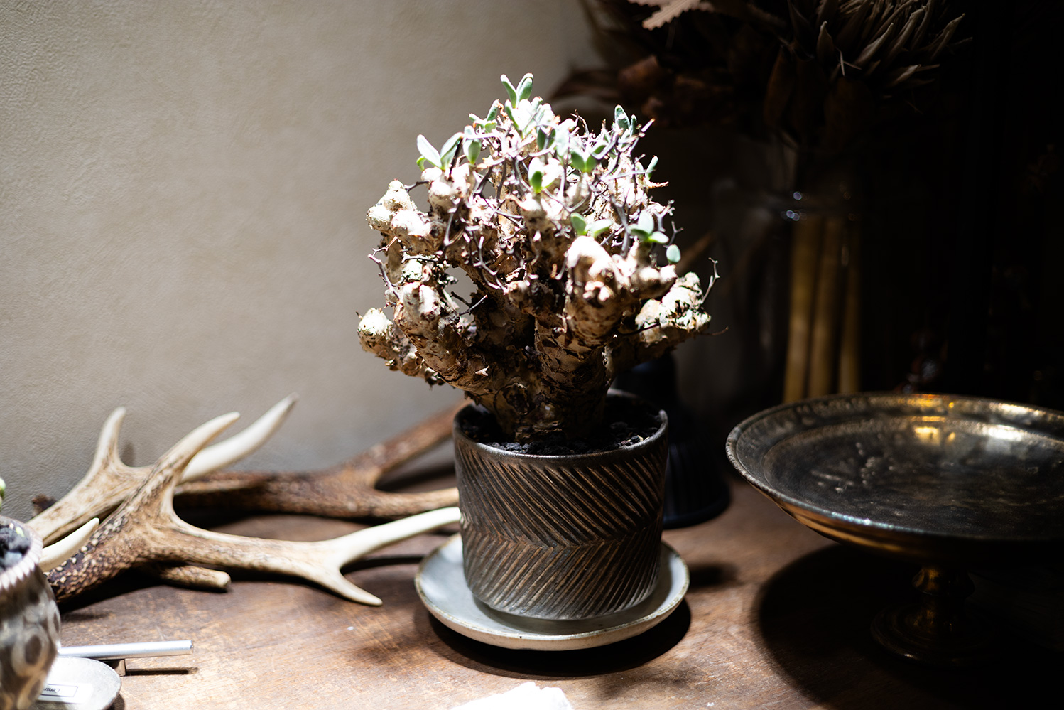 展示スペースには塊根植物が。植木鉢も制作されています。